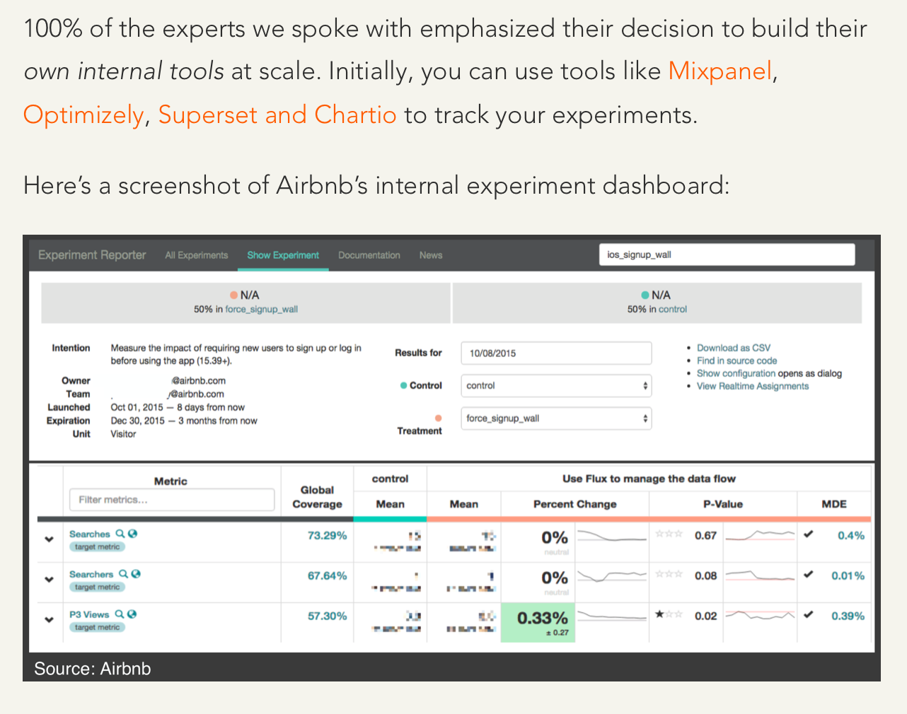 In addition to having tools that can measure various results of experiments, I believe that it is equally important to set up dashboards, communications, and protocols that can be used to communicate the results of the experiments back to the team and to stakeholders. This will help drive focus and accountability back to the team, while at the same time raising the profile of the various things the team is trying so that if any of them are radically successful, the organization can rally around them.