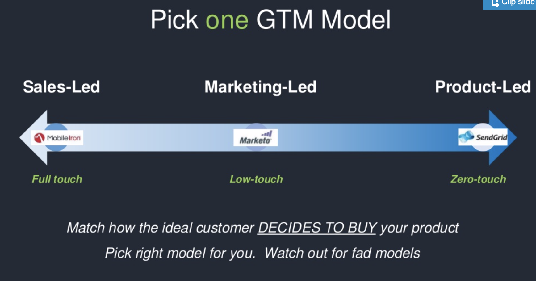 - GTM Model – I found this helpful as well. Tinker suggests a spectrum of GTM models ranging from Sales Led -> marketing led -> Product led.